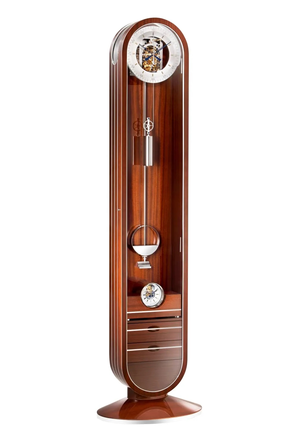 这款钟的机芯由顶部拱形穿透玻璃及带传感器控制的LED灯照明,这样全透明的设计在机械钟领域还是首创。此外,我们还特别使落地钟的桃花心木钟身平稳浮在子弹头形木座上,以此来勾勒一种新时代的科技感。同时,附带的可移动陀飞轮壁炉钟也顺应了如今的全球合作潮流,为使用者提供便捷的第二时区信息。