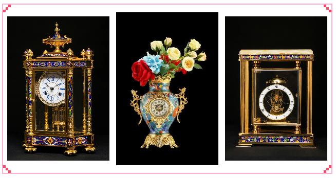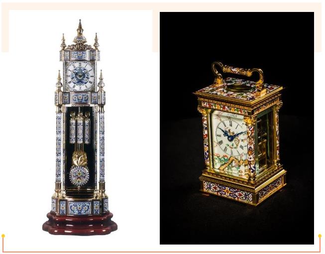 珐琅(景泰蓝)钟表有机融合了钟表与珐琅(景泰蓝)制作技艺的一种创新,它整体采用铜基作结构件,珐琅(景泰蓝)饰片无论平面或异形件均采用薄壁铜胎掐丝珐琅 为银嵌式装配手法,形成严丝合缝端庄大气,为景泰蓝实用化作出了贡献。表面镀24K 金整体色彩层次分明、金碧辉煌、百年不变是金属工艺品和钟表界的一颗璀璨明星,深受社会各界广泛关注。