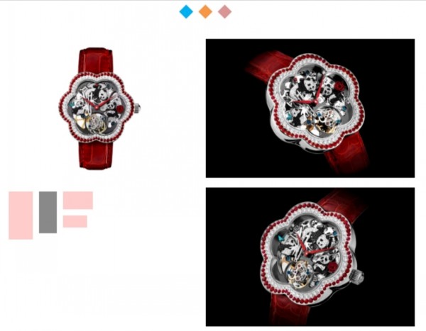 《LOVE LOVE COLLECTION- Family》以中国国宝熊猫为灵感,琦琦还特地打造了镶嵌红宝及白钻的茶花形表壳,更添妩媚。表面上有三只以黑白美钻铸造的小熊猫,牠们坐着、躺着,显得自得其乐,十分可爱!而且他们还用镂空雕刻技术,打造茂密的竹林背景,让熊猫悠闲写意地享受着大自然的乐趣。于3时和9时位置上,分别饰以珍珠贝母打造的牡丹花和蝴蝶装饰作点缀,并于12时位置加入「爱心」图案,突出「爱」的主题。