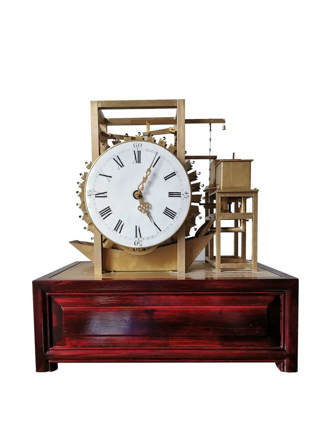 整个水钟全铜制作,附带红木底座,长44.4厘米,宽26.3厘米,高47厘米,大小适宜,兼具实用效果与艺术价值,是中国独有的钟表计时文化之具象体现。